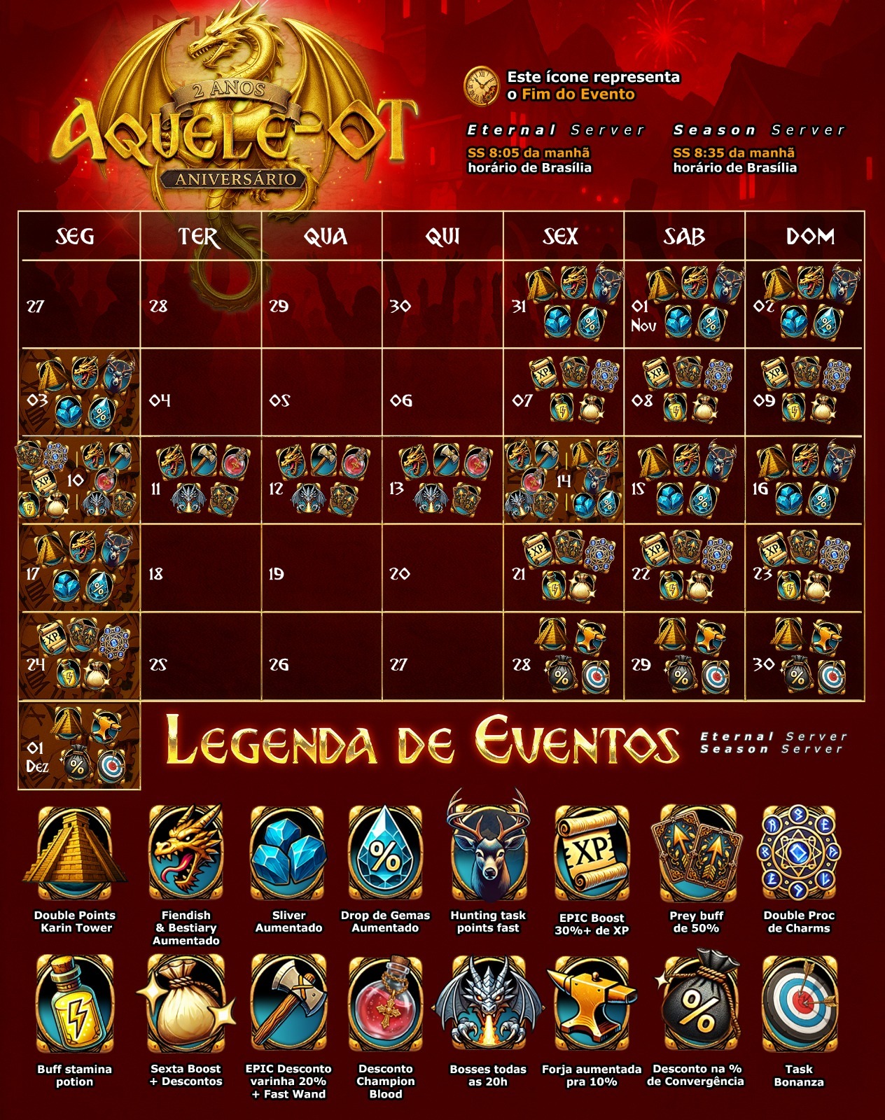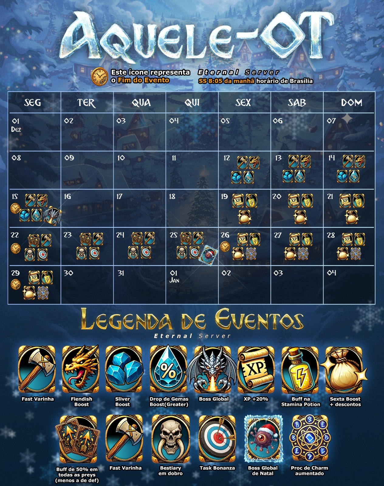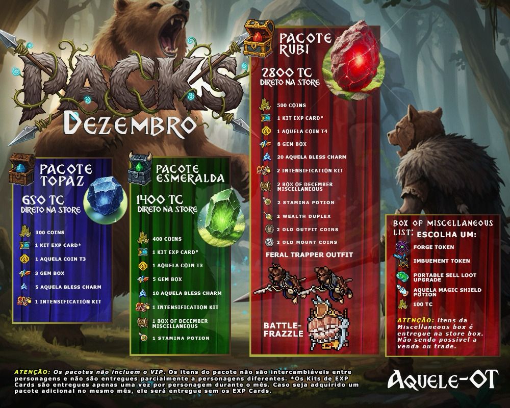 Nesse mês de dezembro, acaba de ser encerrada a primeira season do novo servidor. Foram três meses de novidades e atualizações disponibilizadas em ambos os servidores, com players lutando pelo top 1 e por todas as premiações disponíveis para o top 10 e players que alcançaram o nível 10k. Agradecemos a todos que participaram e contribuíram com essa ideia, toda experiência que tivemos com o lançamento do servidor de season acabará sendo essencial para o futuro do Aquele OT. Acompanhem nossos canais oficiais do Discord e WhatsApp para receber as últimas novidades e atualizações.