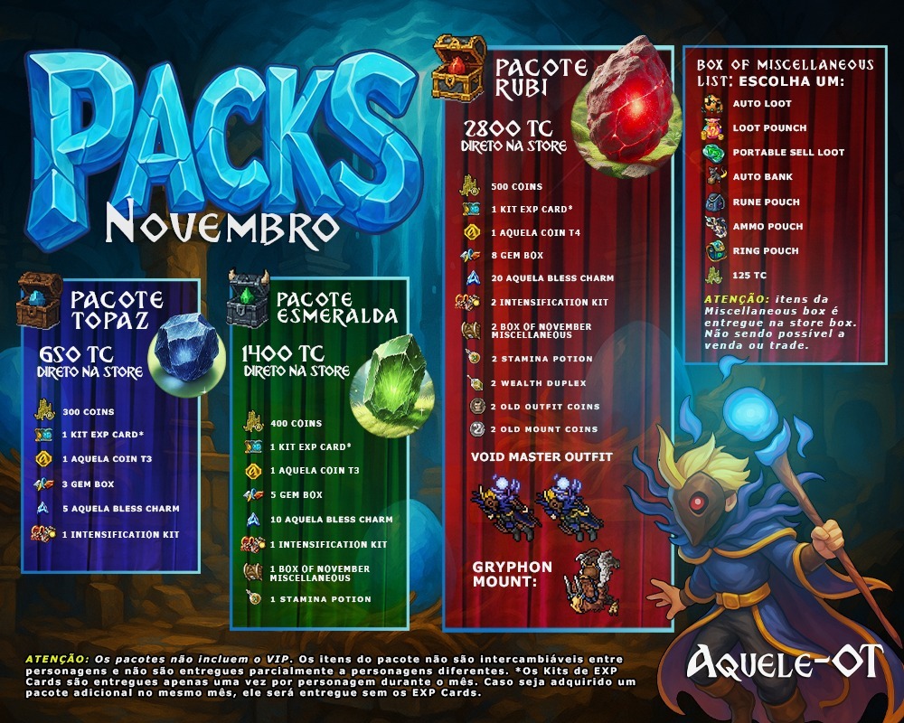 Para comemorar, o calendário desse mês está completamente recheado de eventos. Além dos pacotes mensais, mais dois novos pacotes de aniversário estarão disponíveis na loja do jogo, contendo diversos itens com um preço bacana. Confiram as imagens abaixo com todos os pacotes disponíveis em novembro e o calendário de eventos!