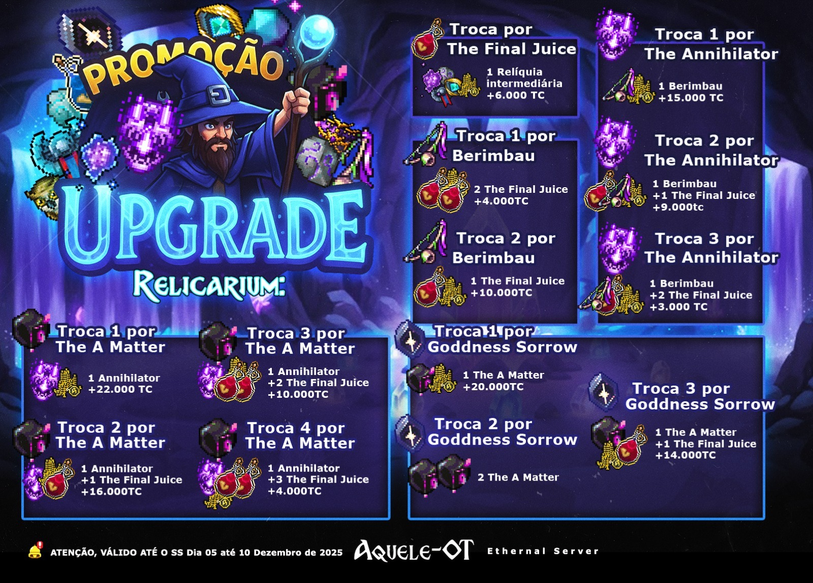 Chegamos ao mês de dezembro com a atualização dos pacotes mensais, calendário de eventos e diversas opções no relicarium, seguimos com a nossa programação de fim de ano com o foco em conteúdos que atinjam todos os players. Com a volta do relicarium, diversas promoções em trocas de relíquias estão disponíveis por ticket no Discord novamente, basta entrar em contato informando a opção desejada, confira a imagem mais abaixo para escolher a melhor opção para você.