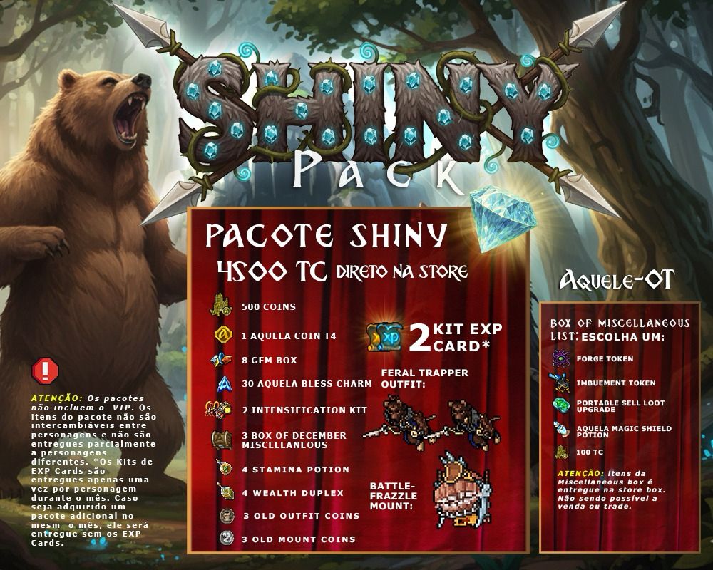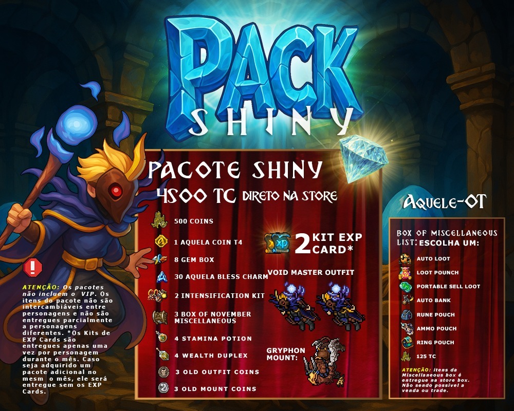 Continuando para os pacotes mensais, nesse mês também teremos o pacote Shiny, que é uma versão aprimorada do pacote Rubi com o qual já estamos acostumados. Recentemente, lançamos um update de diferentes buffs de acordo com os outfits ou mounts do player, alguns buffs são específicos de outfits e mounts dos pacotes mensais. Caso o player se interesse por alguma opção de meses anteriores, o pacote Rubi e Shiny possuem Old Outfit e Old Mount coins, que podem ser utilizados como moeda de troca no NPC Azyhu para escolher opções de meses passados. Confiram as imagens abaixo com todas as novidades deste mês.