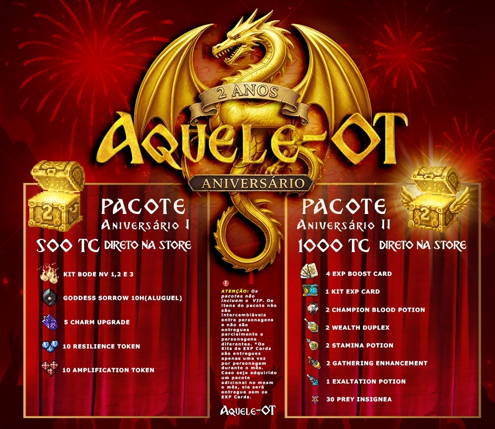 Chegou o momento de comemorarmos 2 anos de servidor e agradecermos o apoio de todos os players que estão conosco e que passaram por aqui. Durante todo esse período, passamos por inúmeras atualizações, sempre visando a melhoria do servidor em todos os aspectos. Agradecemos todos os feedbacks recebidos até hoje, sem eles, o tempo para aprimorar diversas mecânicas do servidor seria muito maior, várias ideias também acabam saindo ou sendo adaptadas a partir dessas interações com os jogadores. Continuaremos atualizando o servidor para sempre buscar melhorar a experiência de todos, nos vemos no Aquele OT!