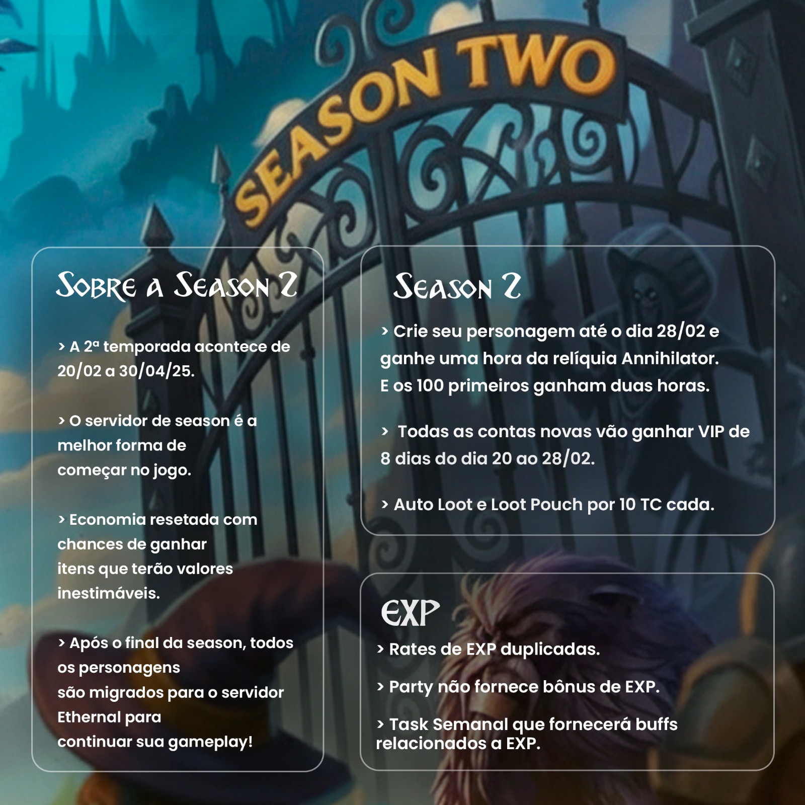 Ao final da temporada, seu personagem e itens serão migrados para o servidor principal, caso queira continuar jogando.